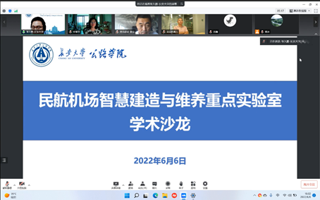 2022年6月6日下午,民航机场智能建造与维养重点实验室采用线上线下相结合的方式成功举办“人工智能技术在民航机场场道建管养的应用”学术沙龙。本次学术沙龙由重点实验室主任汪海年教授召集,特邀长安大学申爱琴教授、郝培文教授、圭目机器人有限公司创始人桂仲成博士、民航机场工程技术研究中心叶松总工程师、西北民航建设集团有限公司戴征总经理、江苏增光新材料科技股份有限公司周庆月总经理做主题发言。永利集团304am副院长、民航重点实验室副主任张久鹏教授主持学术沙龙,民航西北设计院、咸阳机场、福州机场、翔安机场、邯郸机场等管理和技术骨干以及机场工程系全体教师和在校研究生80余人参加了学术沙龙。