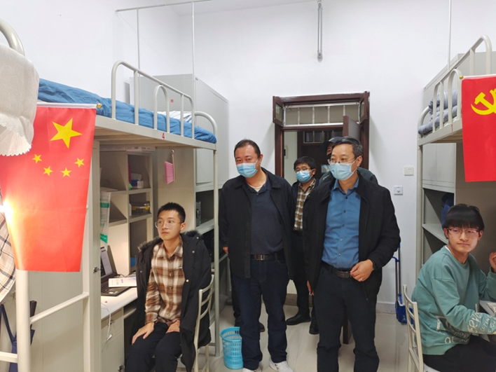院领导还查看了宿舍文化墙布置、公寓消防安全、辅导员走访宿舍等方面的工作情况,并向坚守岗位的辅导员老师表示慰问,对他们工作给予了肯定,同时要求辅导员老师要以高度的责任感将学生工作继续落实、落细,并不断创新工作的方式与方法,加强理论与实践融合共进,用心用情做好学生思想教育工作,不断提高服务管理水平。