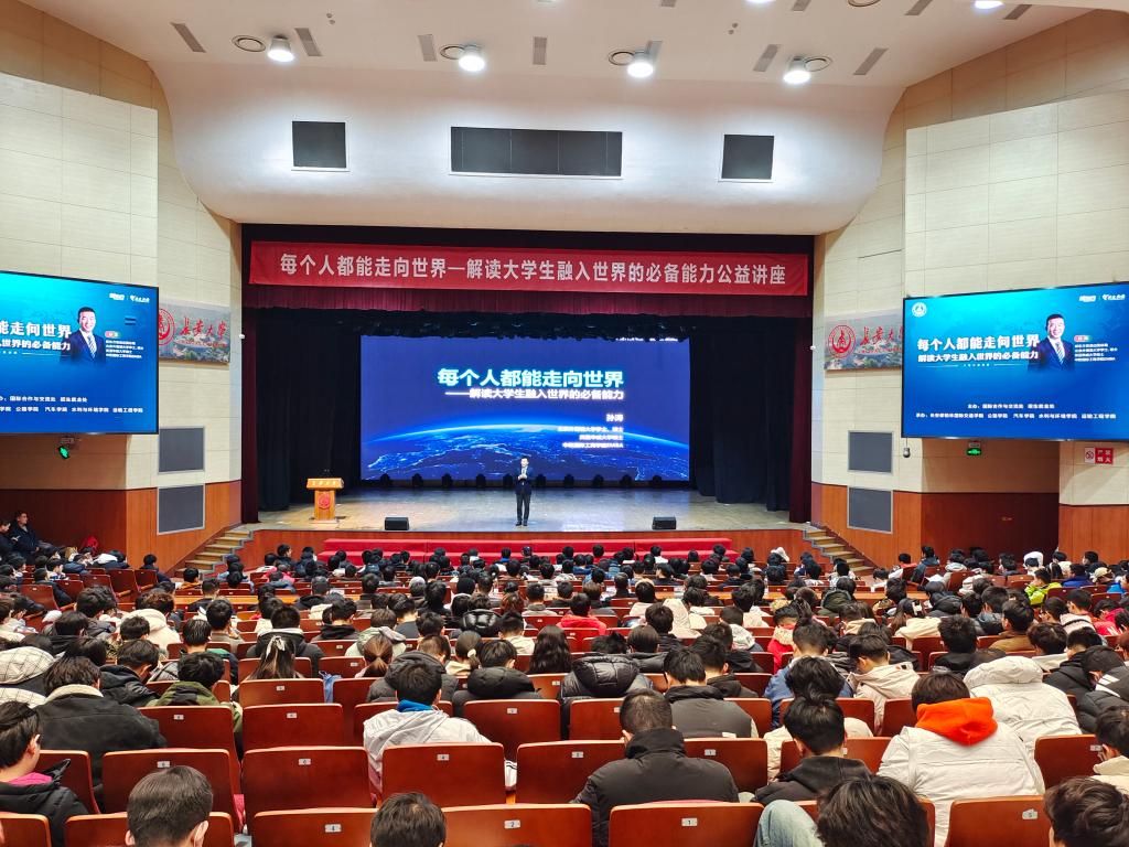 12月13日晚新东方教育科技集团助理副总裁、新东方前途出国总裁孙涛受邀来校作“每个人都能走向世界——解读大学生融入世界的必备能力”大型公益讲座。本次活动由学校国际合作与交流处、招生就业处主办,永利集团304am、长安都柏林国际交通学院、汽车学院、水利与环境学院、运输工程学院联合承办,来自各院(系)的1000余名学生在北校区长安文化艺术中心大礼堂参加讲座。