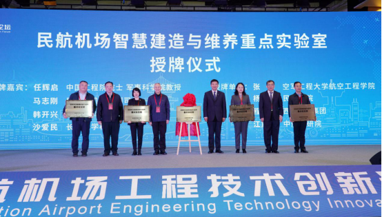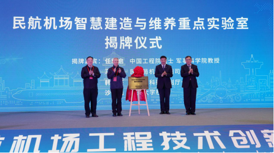 开幕式上,任辉启、马志刚、韩开兴和沙爱民共同为长安大学牵头组建的“民航机场智慧建造与维养重点实验室”揭牌,为共建单位代表授牌。