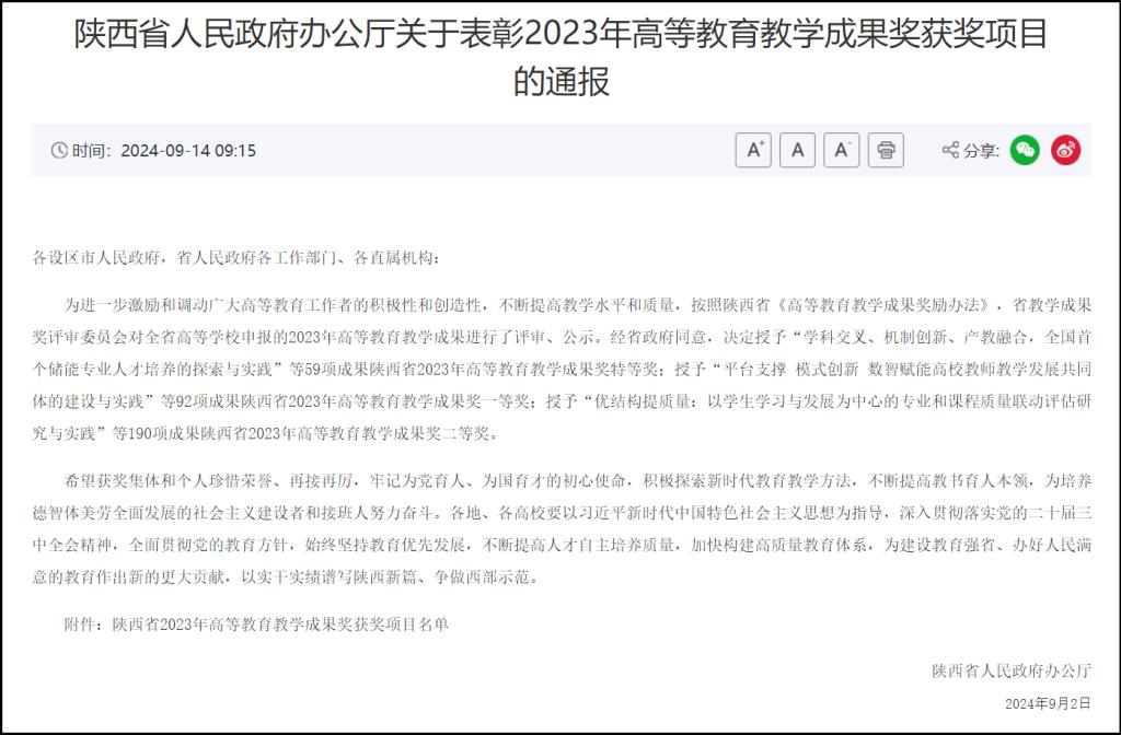 近日,陕西省人民政府发布《陕西省人民政府办公厅关于表彰2023年高等教育教学成果奖获奖项目的通报》(陕政办函〔2024〕104号),永利集团304am共3项成果获奖,其中特等奖1项,一等奖1项,二等奖1项。