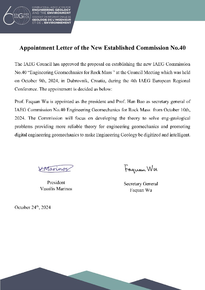 我院教师当选国际工程地质与环境协会(IAEG)岩体工程地质力学委员会秘书长