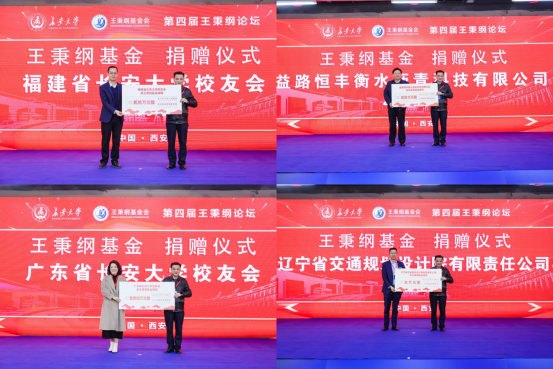 随后,论坛举行了捐赠仪式。福建省长安大学校友会、益路恒丰衡水沥青科技有限公司、广东省长安大学校友会、辽宁省交通建设投资集团下属的辽宁省交通规划设计院有限责任公司向“王秉纲基金”进行捐赠。