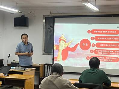 王晓明就落实和推进学院师德师风宣传教育月系列活动、纪律教育学习宣传月系列活动和教职工理论学习制度等工作进行了详细安排;带领大家学习了《高等学校教师职业道德规范》《新时代高校教师职业行为十项准则》,围绕高校教师师德失范案例开展警示教育。周勇军带领大家学习了《中国共产党纪律处分条例》《中国共产党问责条例》,观看了《一抓到底正风纪—秦岭违建整治始末》专题纪录片,引导支部党员和教职员工强化理论武装,坚定理想信念,增强政治定力,提高廉洁自律意识,勇于担当作为。