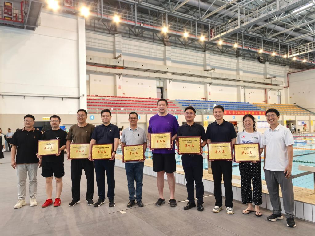 比赛当日,泳池内浪花翻涌,加油声此起彼伏。我院参赛教职工斗志昂扬,在水中劈波斩浪。在团体赛中,队员们默契配合、奋力冲刺,凭借出色发挥,从21支队伍中脱颖而出,一举夺得团体赛冠军,实现在此赛事中我院荣获“三连冠”的好成绩;男子个人赛中,赵瑞欣老师更是一马当先,以绝对优势率先触壁,将男子个人第一名收入囊中,这也是他实现“三连冠”的好成绩。这两项荣誉的取得,不仅充分验证了老师们的雄厚实力,更是我院团队凝聚力的生动体现。